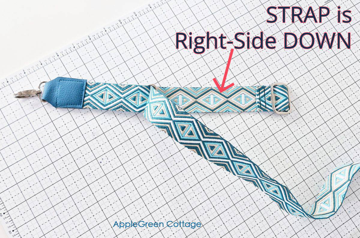 Place the long strap with the right side down. Slide the free end of the long strap through the rectangle ring on the short piece.