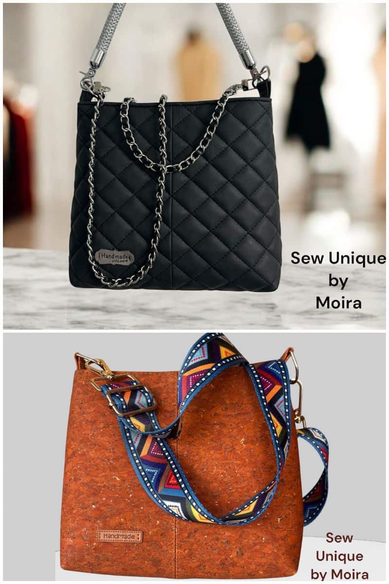 Moira @sewuniquebymoira made three Lumera bags - one in elegant lace cork (see that handle!), one in beautiful cork with orange and golden accents, and one in beautifully quilted black faux: