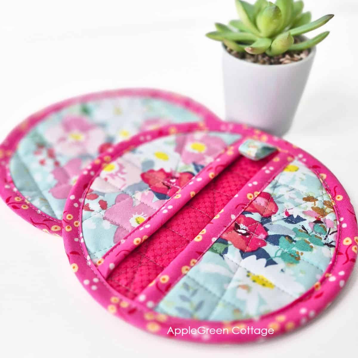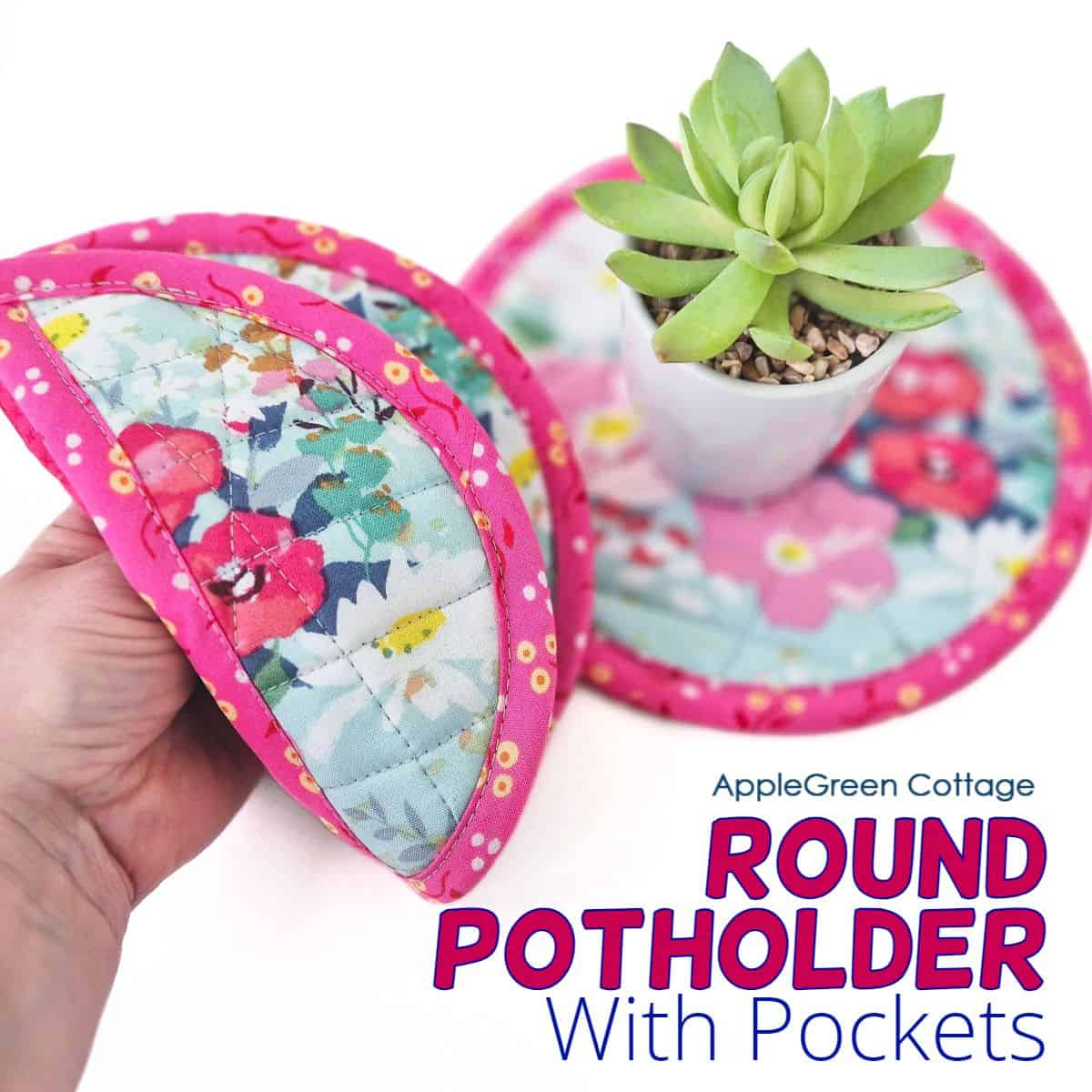 See how to sew a round potholder with our free round potholder sewing pattern in 2 sizes. It's got pockets!